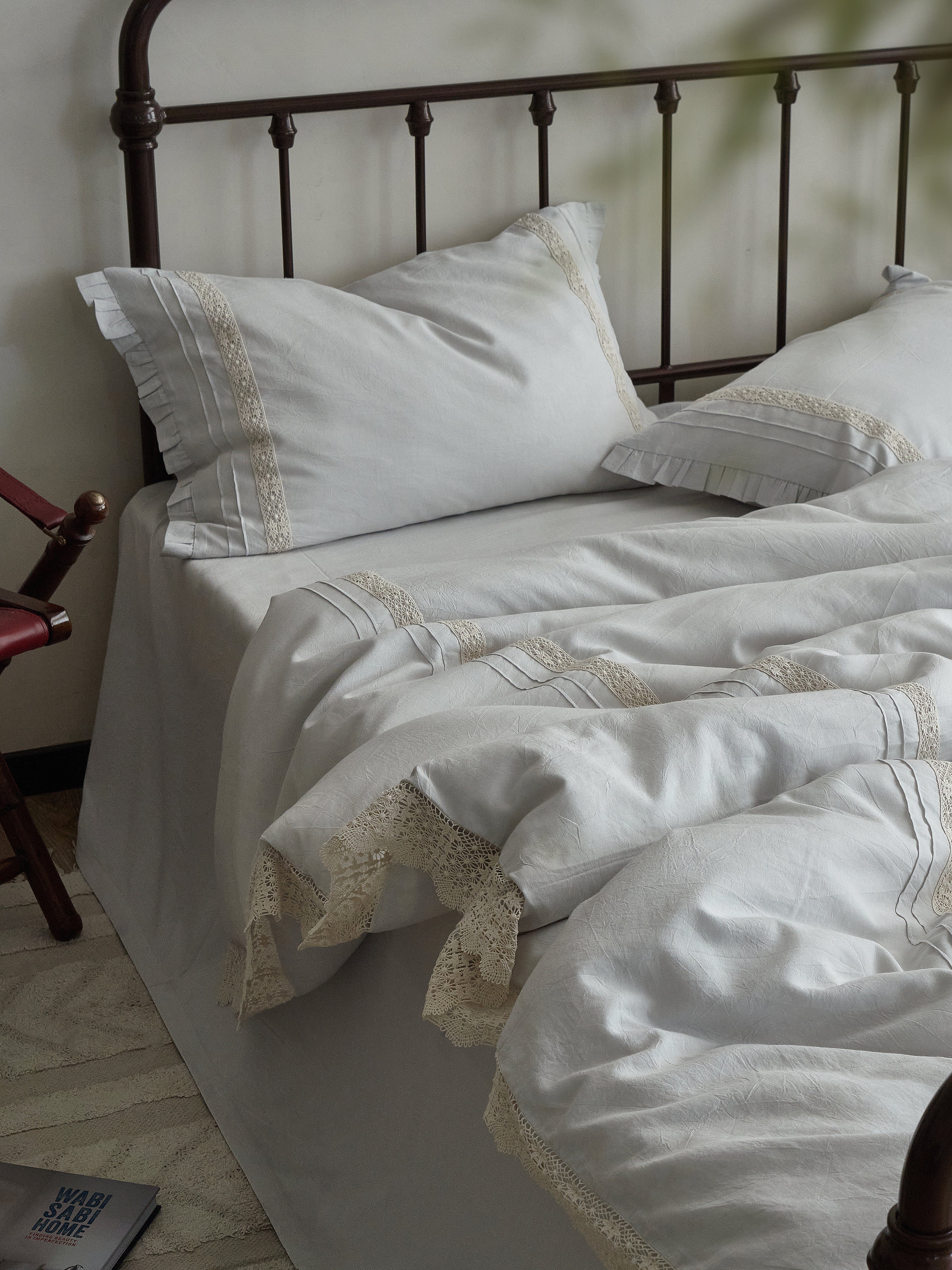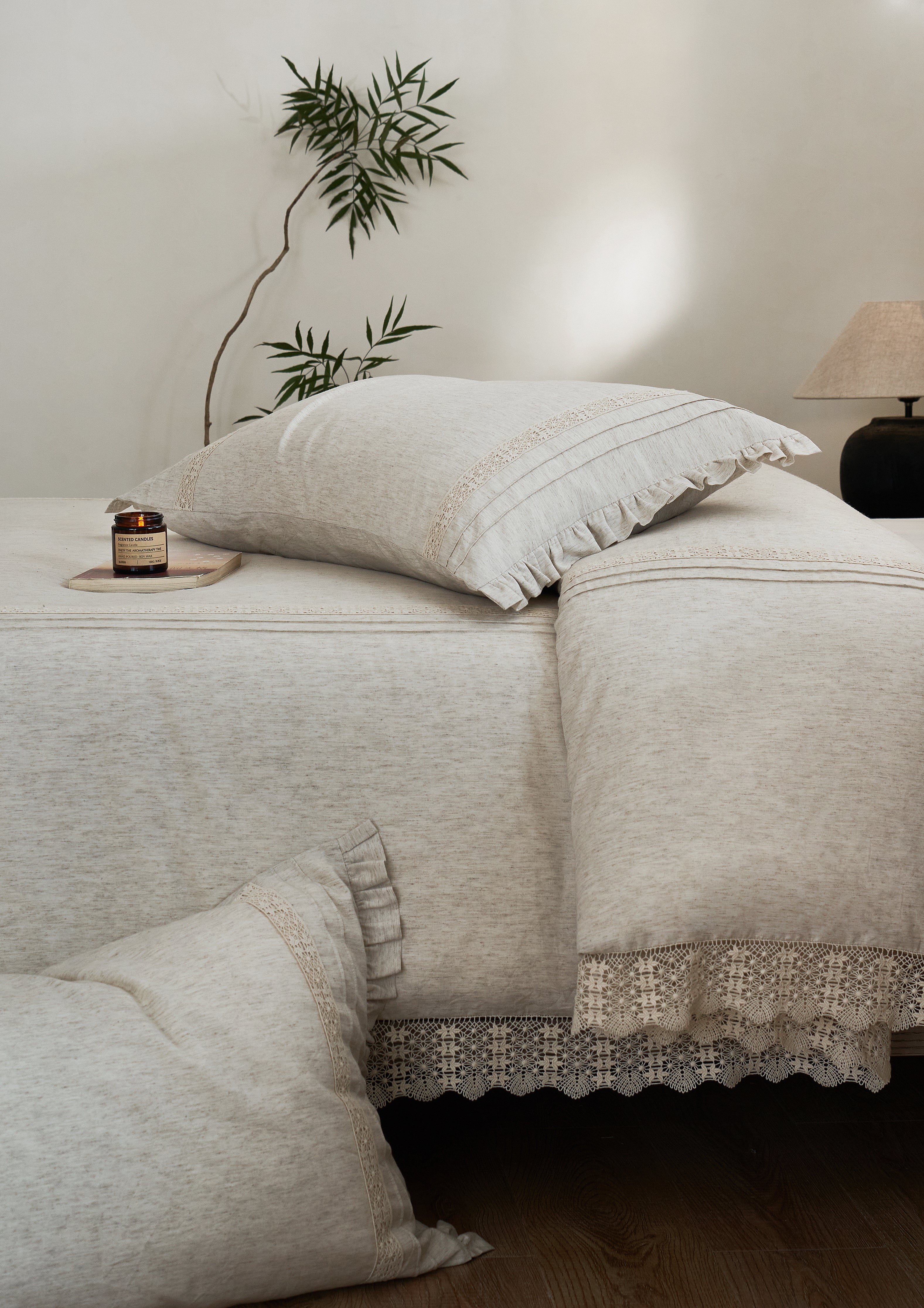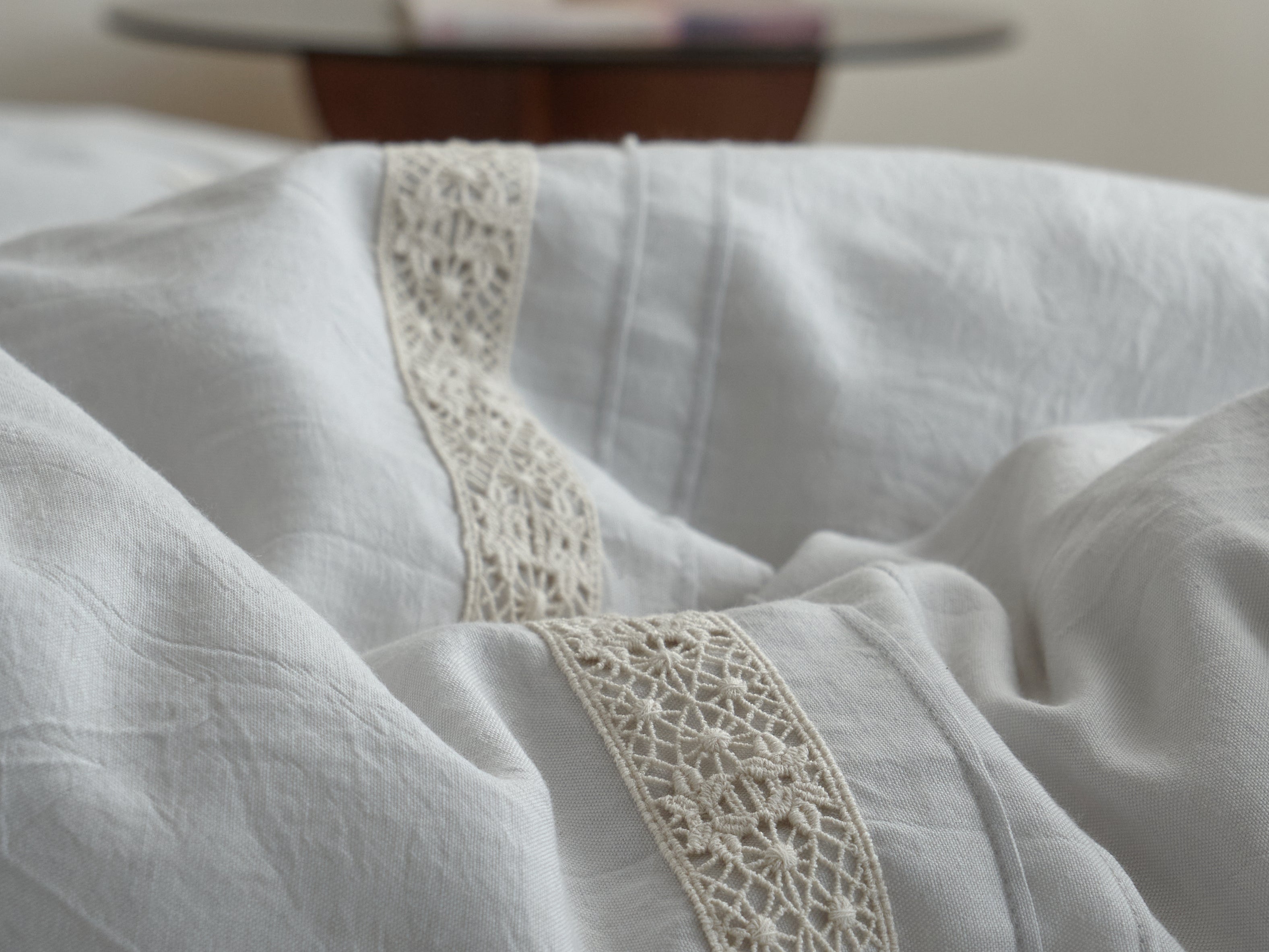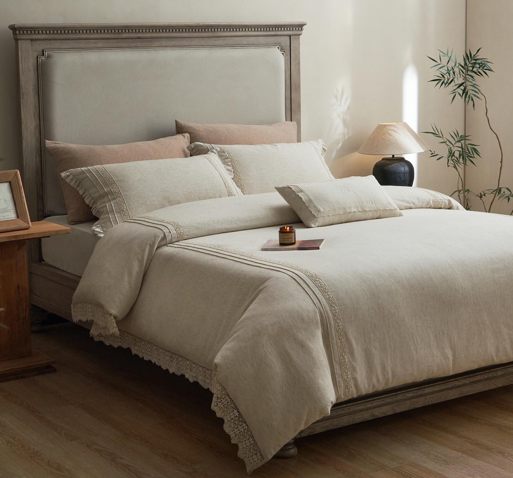 AVA.Home"浅語" (Sasayaki) プレミアム・テンセルリネン 4点セット | 生成り・くすみカラー | 繊細なレースとフリル