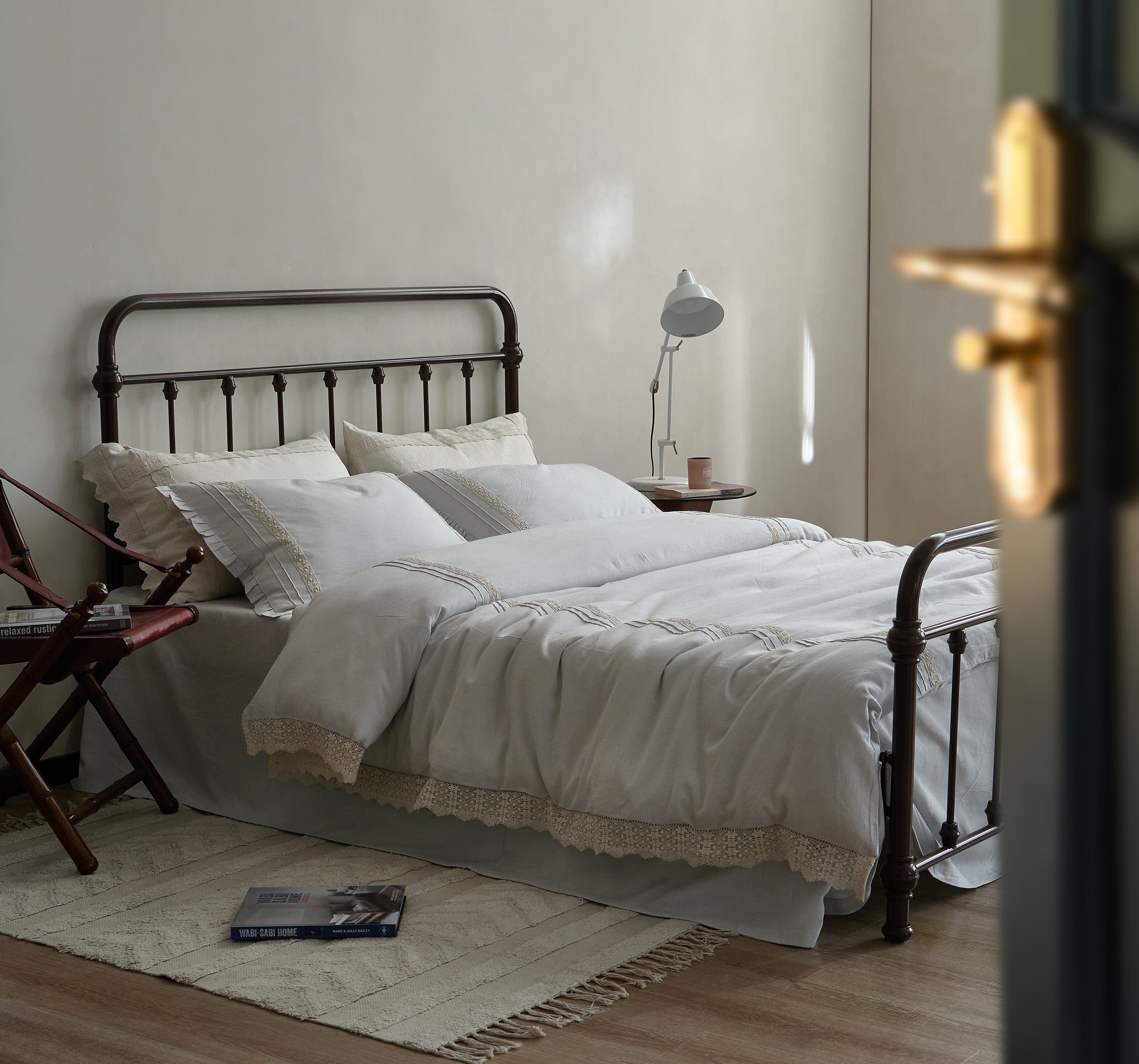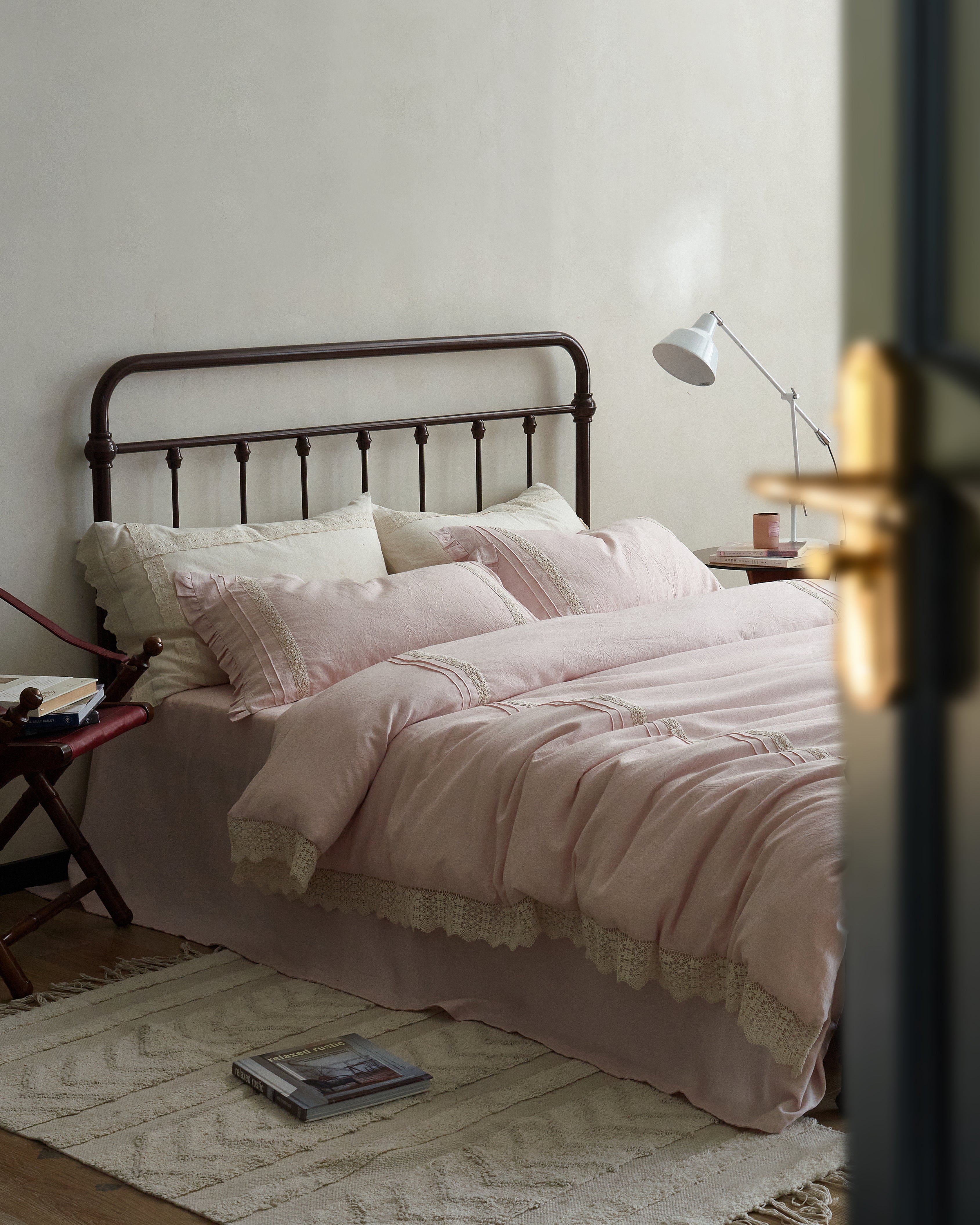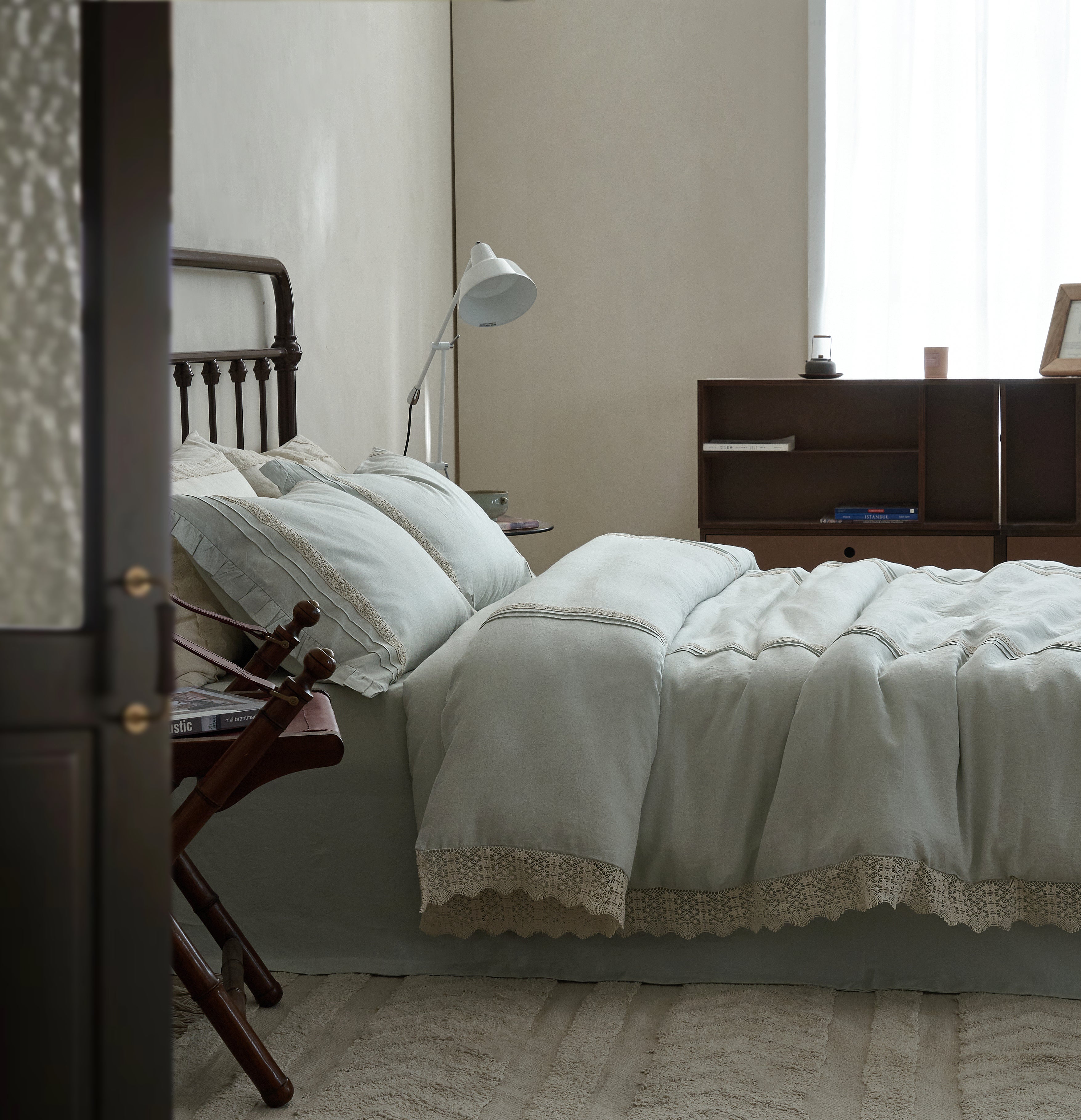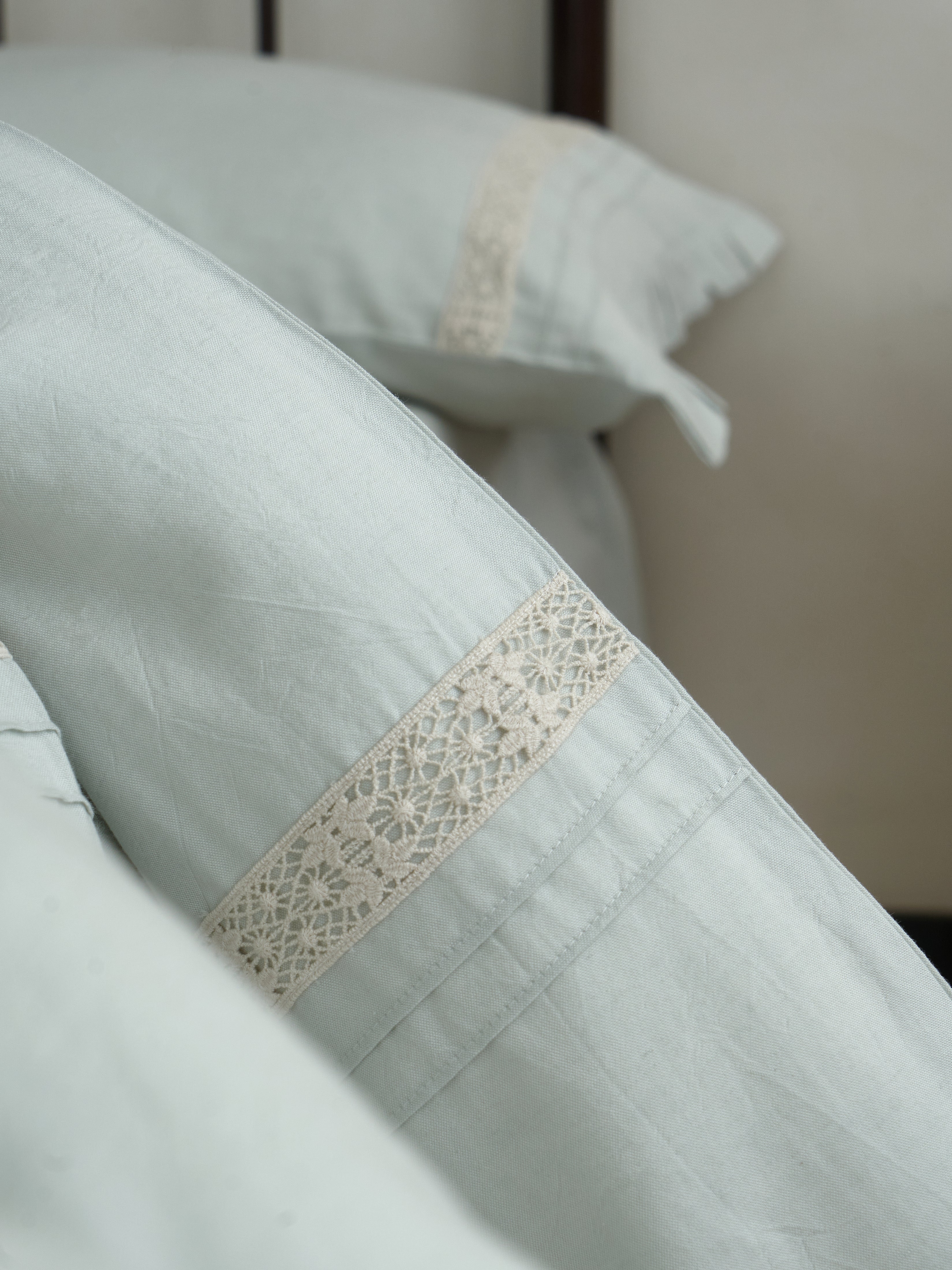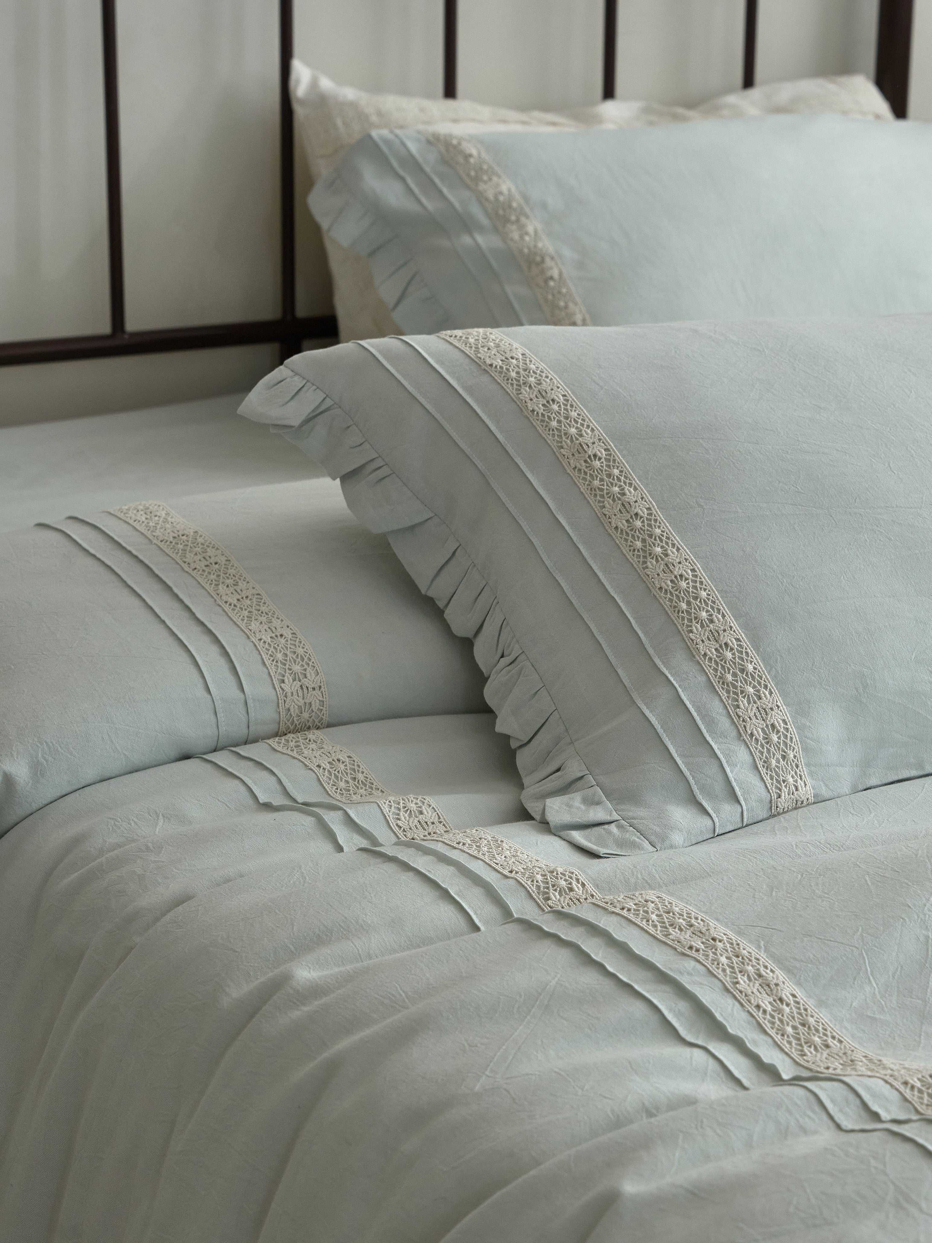 AVA.Home"浅語" (Sasayaki) プレミアム・テンセルリネン 4点セット | 生成り・くすみカラー | 繊細なレースとフリル