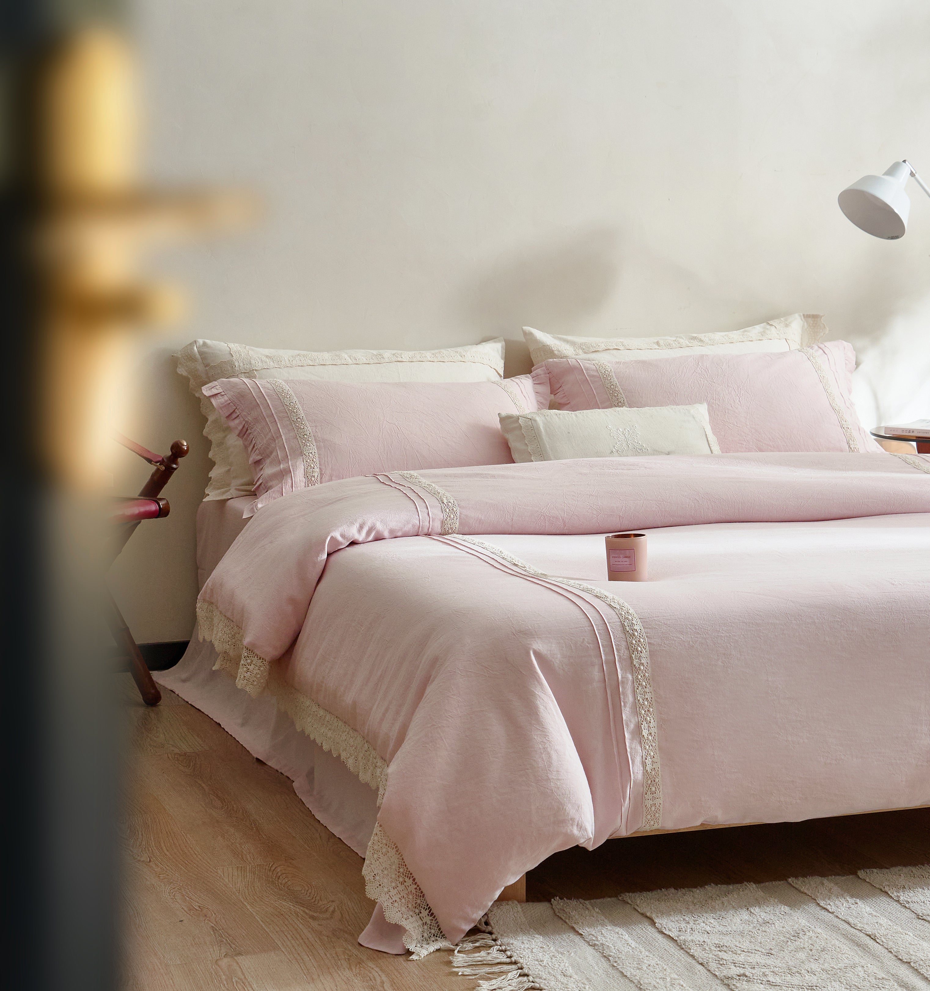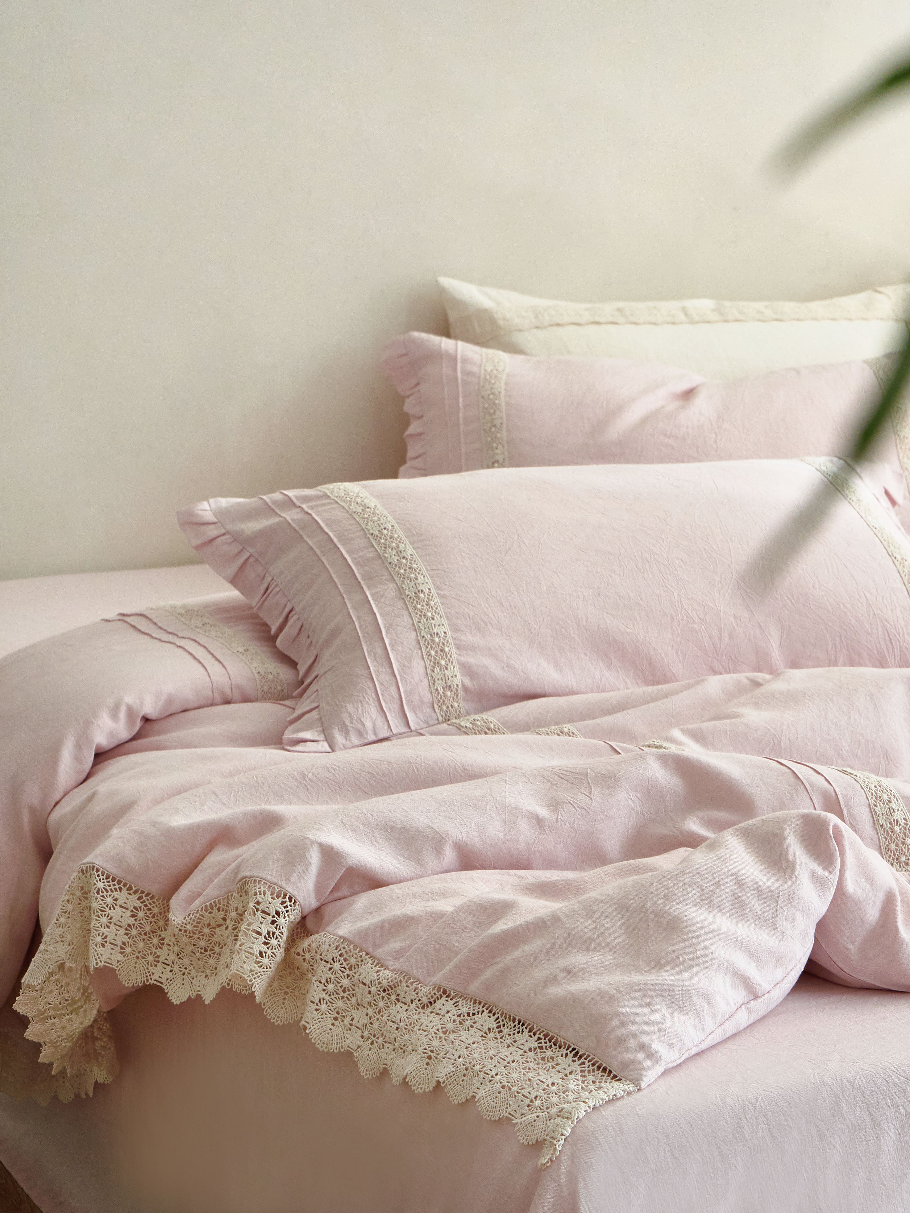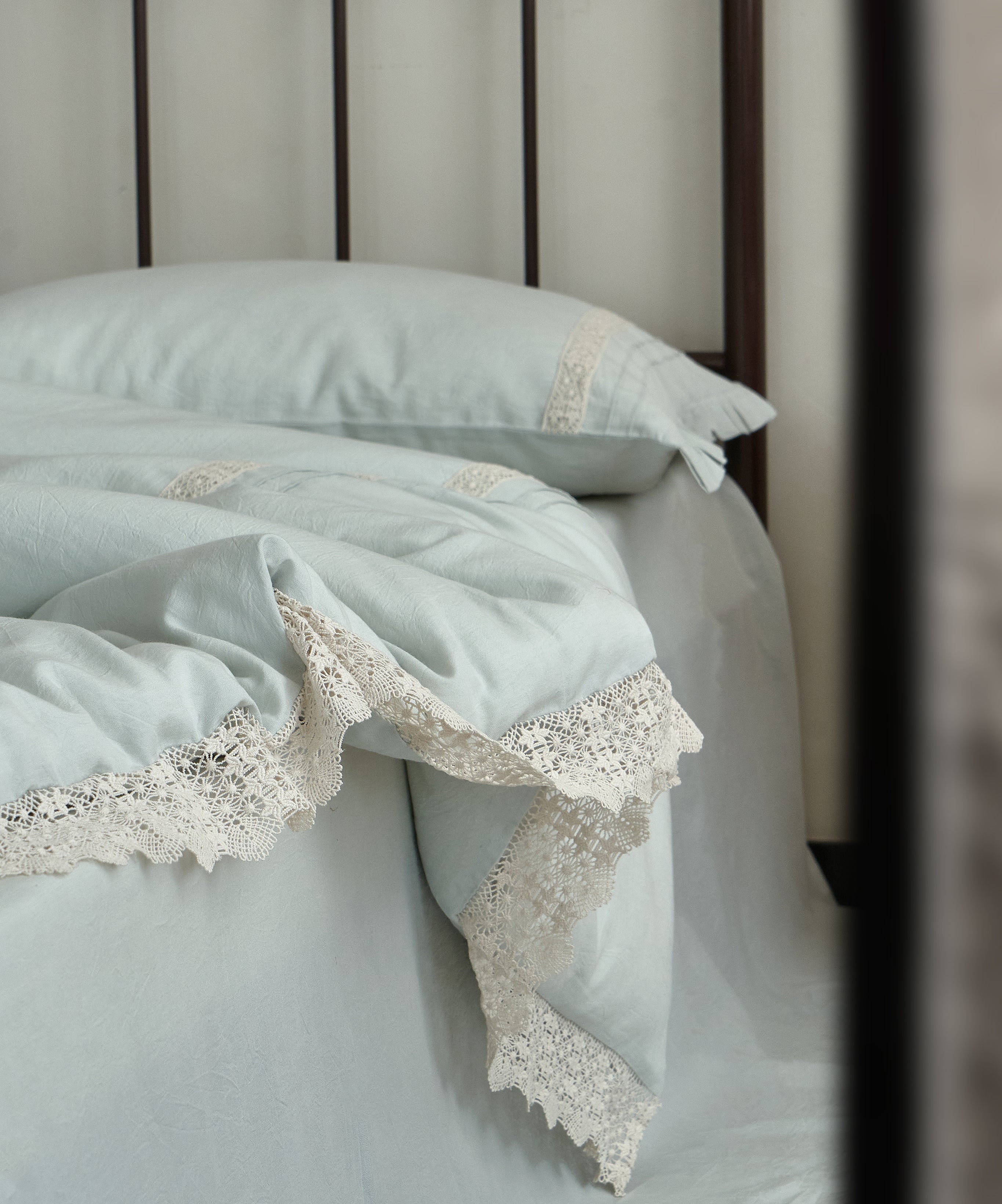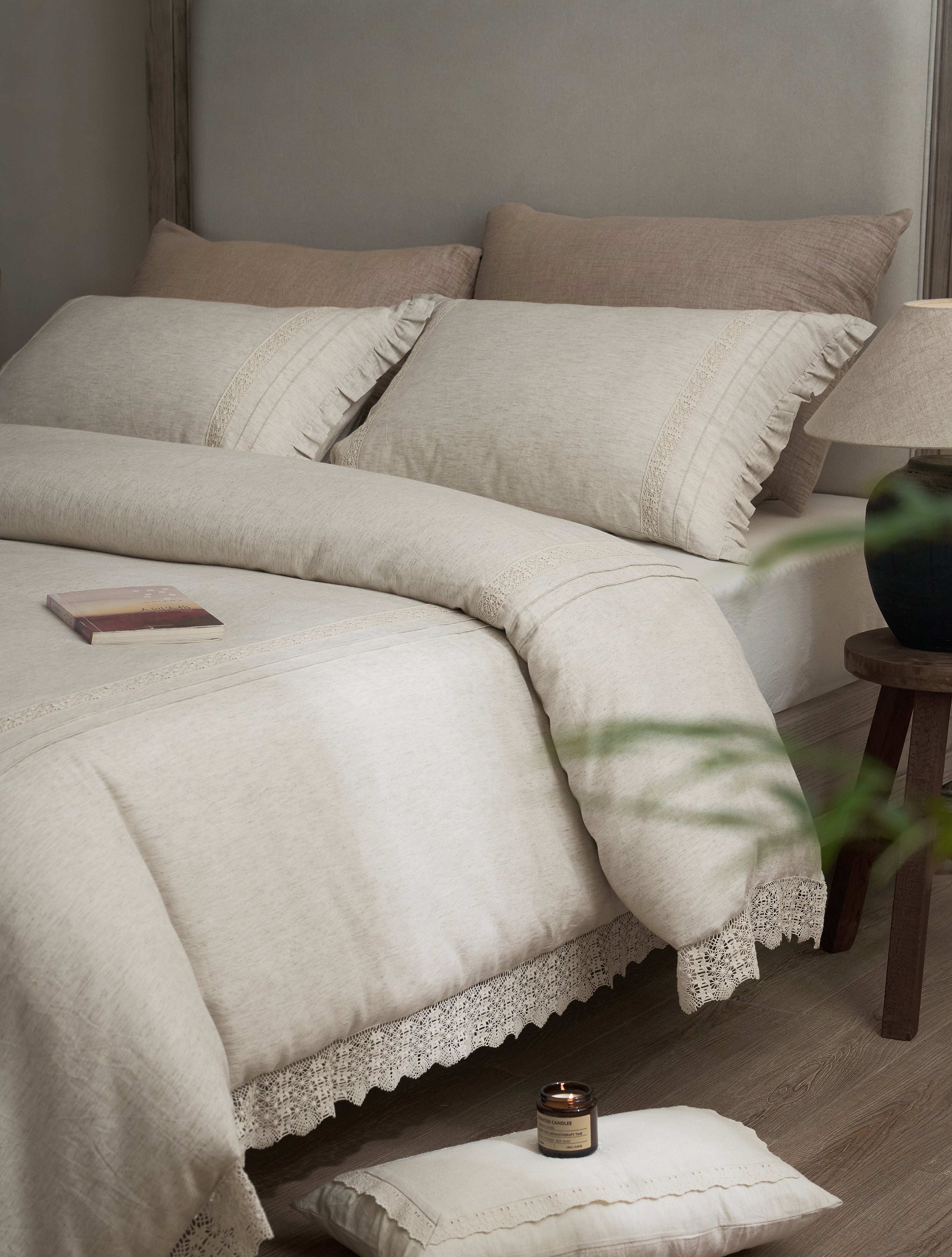 AVA.Home"浅語" (Sasayaki) プレミアム・テンセルリネン 4点セット | 生成り・くすみカラー | 繊細なレースとフリル
