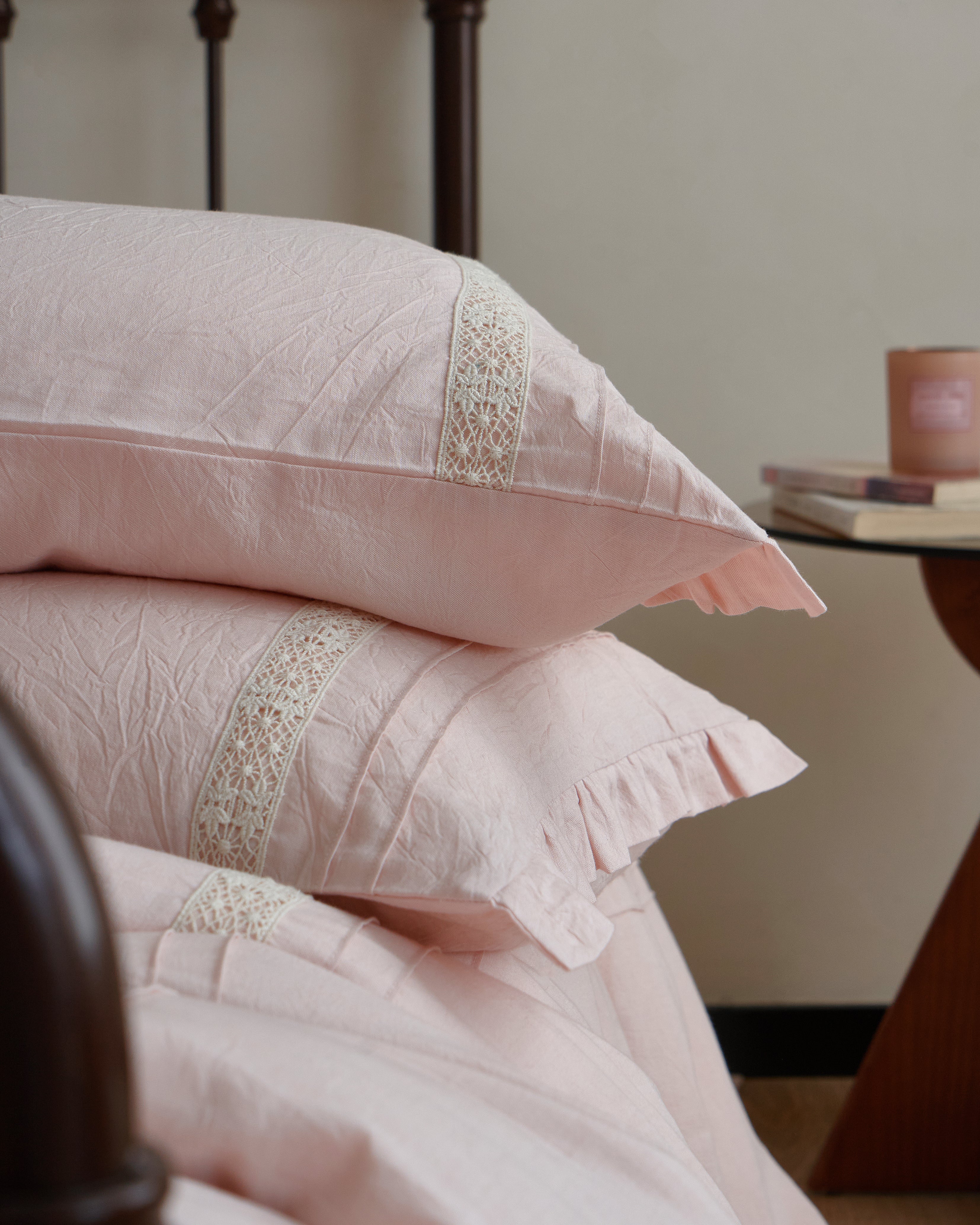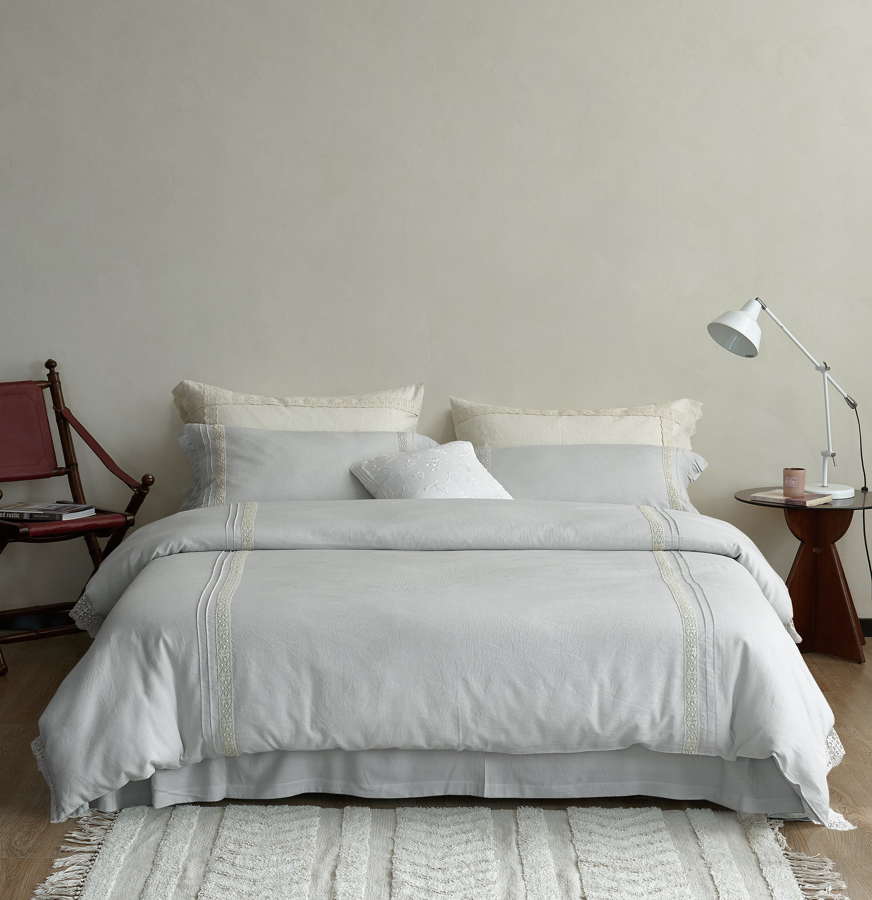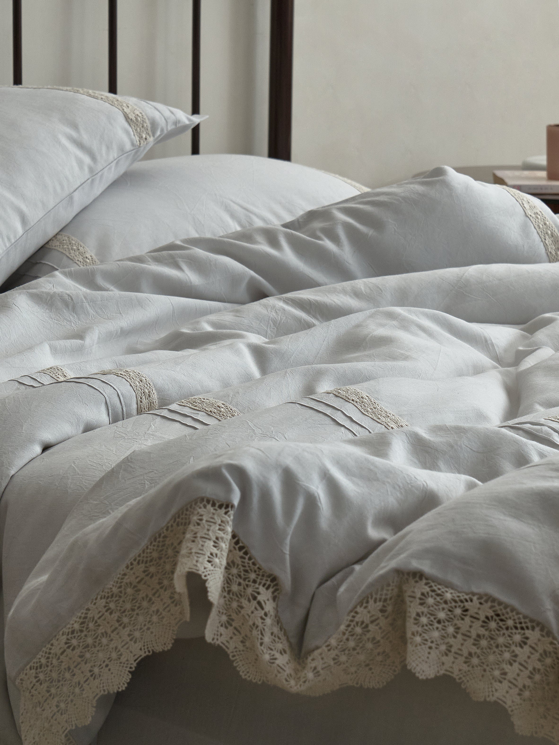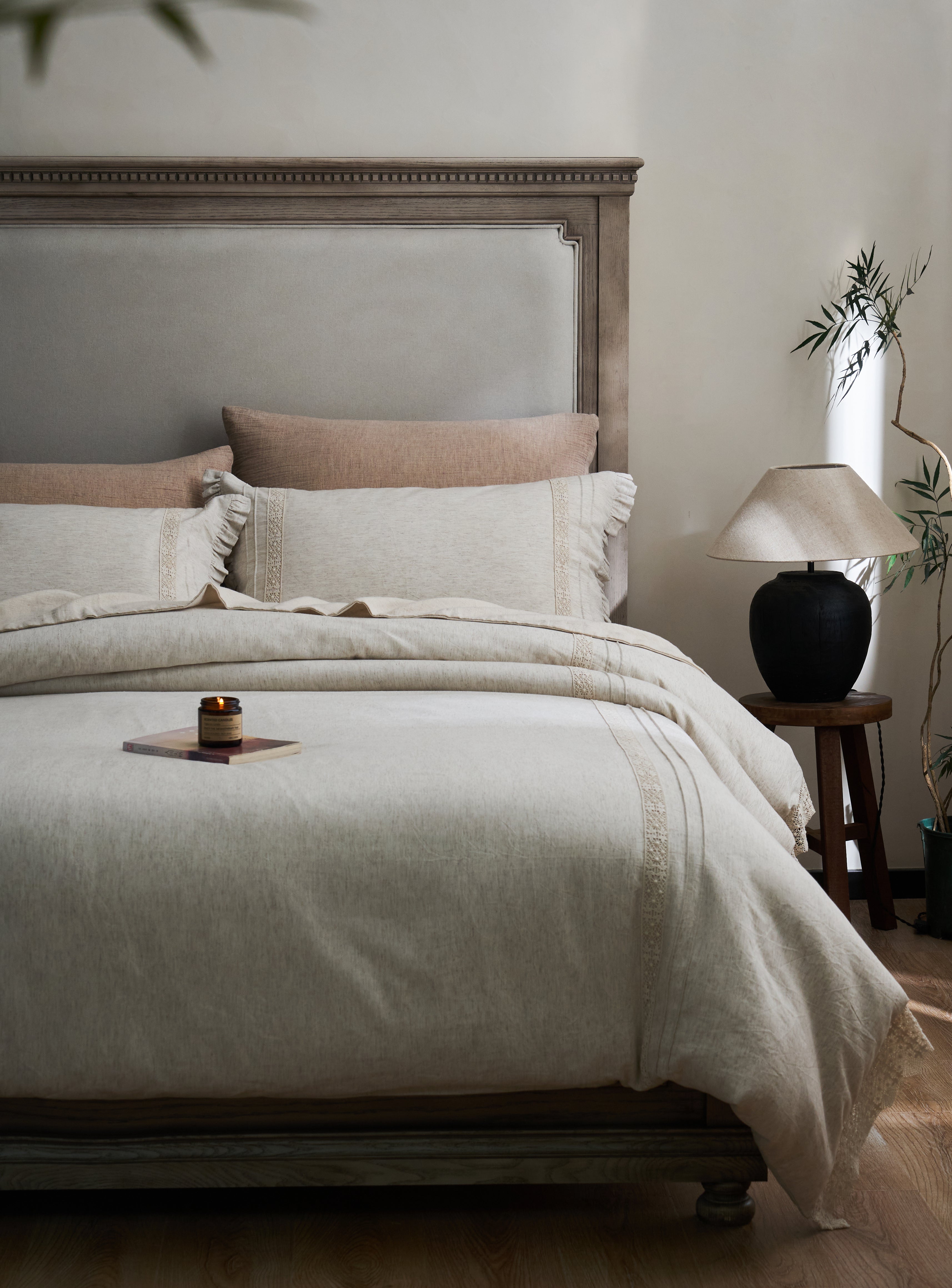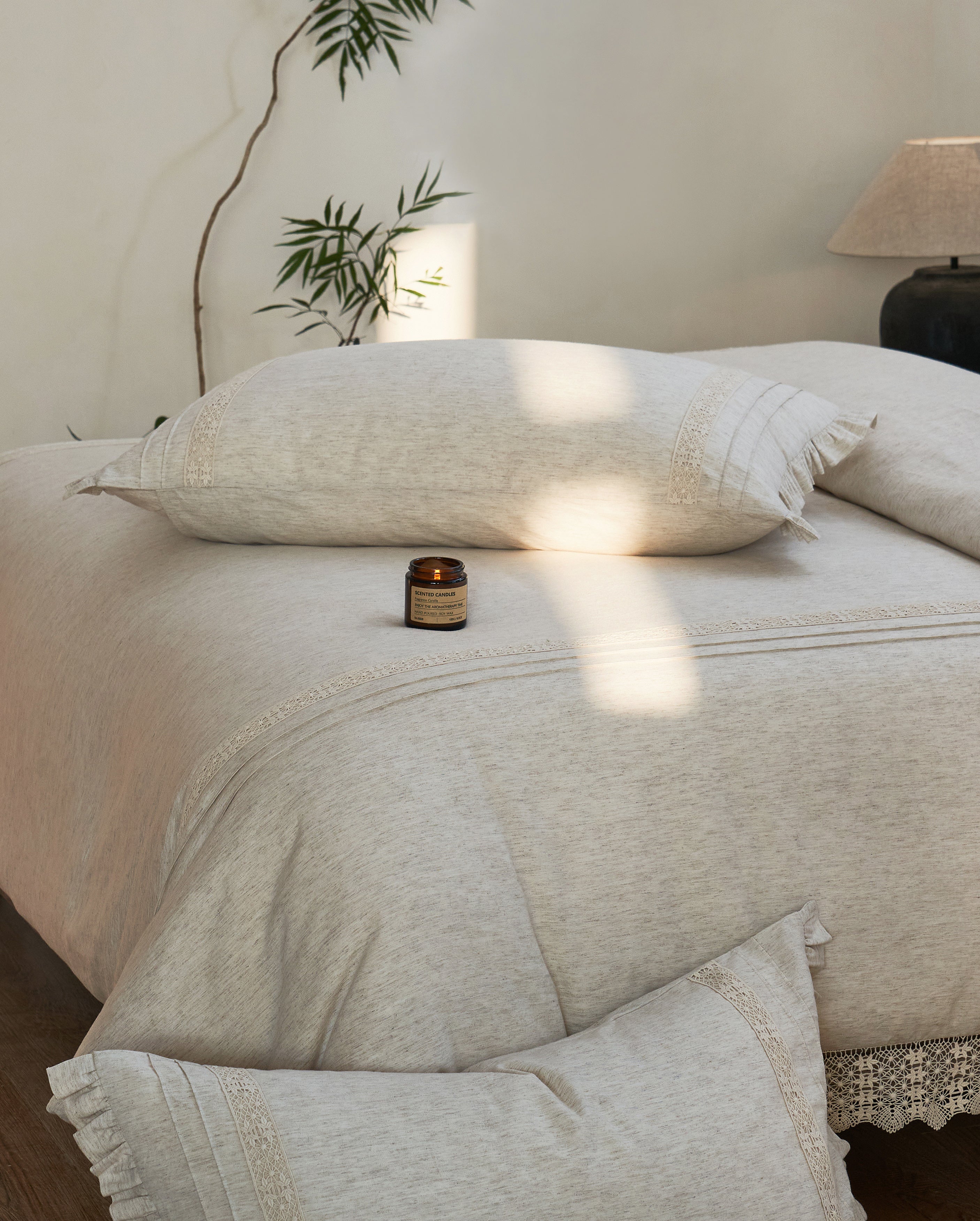 AVA.Home"浅語" (Sasayaki) プレミアム・テンセルリネン 4点セット | 生成り・くすみカラー | 繊細なレースとフリル